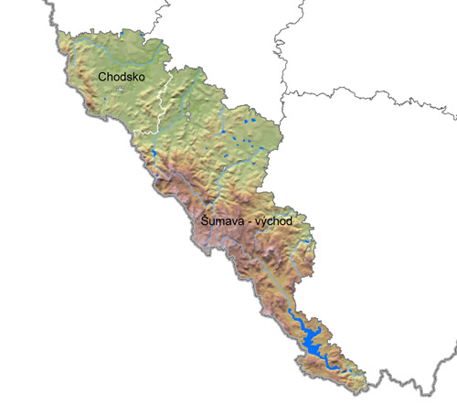 Šumava jako samostatný turistický region se rozkládá na území dvou krajů - Jihočeského a Plzeňského a zahrnuje v sobě dvě turistické oblasti: Šumava-východ a Chodsko.